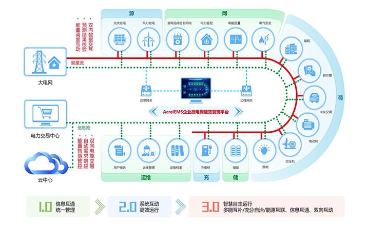 簡介:1.概述 通過在源、網、荷、儲、充的各個關鍵節點安裝監測、分析、保護、治理裝置, 通過高性能邊緣計算網關采集數據并上傳至企業微網平臺。平臺根據新的電網價格、 用電負荷、電網調度指令等情況,調整各系統控制策略并遠程下發,使企業微電網始終高效穩定運行, 降低企業用電成本,實現能源互聯、信息互動。 2.應用場所 適用于各行業企業內部微電網管理系統的新建、擴建、改建等項目。 3.平臺結構 3.平臺功能 安科瑞AcrelEMS企業微電網能效管理平臺融合了電力監控、電氣安全、照明控制、能源管控、充電樁運營管理、分布式光伏監測、儲能管理、設備臺賬、運維管理等功能,通過一個平臺、一個APP整體的對企業用電進行集中監控、統一調度、統一運維,并且根據當地供電部門錯峰避峰計劃提前為企業制定錯峰避峰方案和預警,滿足企業
